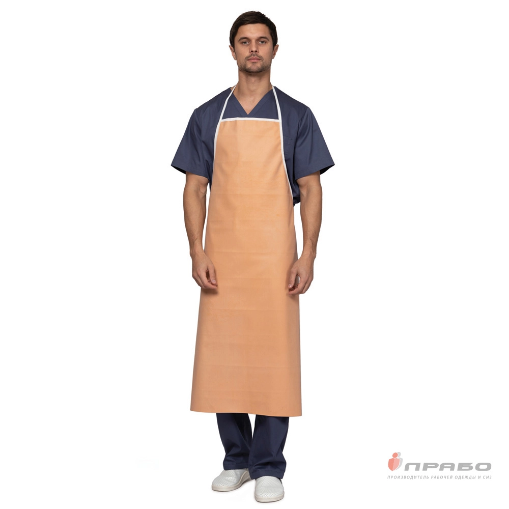 Универсальный фартук для работников пищевой, химической промышленности. Изготовлен из прорезиненного хлопка плотностью 440-500 г/м² и хорошо защищает от влаги и нетоксичных веществ. Модель имеет высоту 105 см и ширину подола — 83 см. Такой размер позволяет закрыть и защитить тело и одежду работника. Фиксируется фартук при помощи шейной бретели, которая переходит в завязки на спине в области талии.